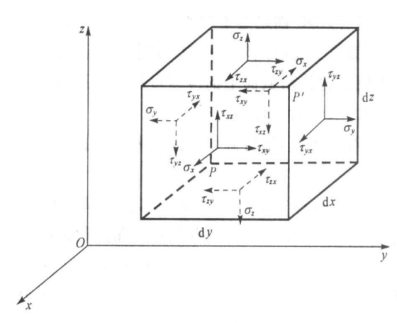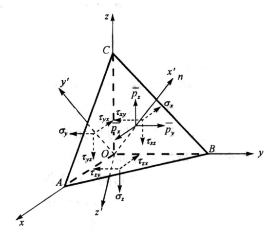 柯西公式 (Cauchy Formula): 斜面上的全应力矢量 $\vec{P} = (P_x, P_y, P_z)$ 与坐标面应力分量的关系为(张量记法): $$ P_i = \sigma_{ij} n_j \quad (i,j = x,y,z) $$ 展开形式: $$ \begin{cases} P_x = \sigma_x l + \tau_{xy} m + \tau_{xz} n \\ P_y = \tau_{yx} l + \sigma_y m + \tau_{yz} n \\ P_z = \tau_{zx} l + \tau_{zy} m + \sigma_z n \end{cases} $$