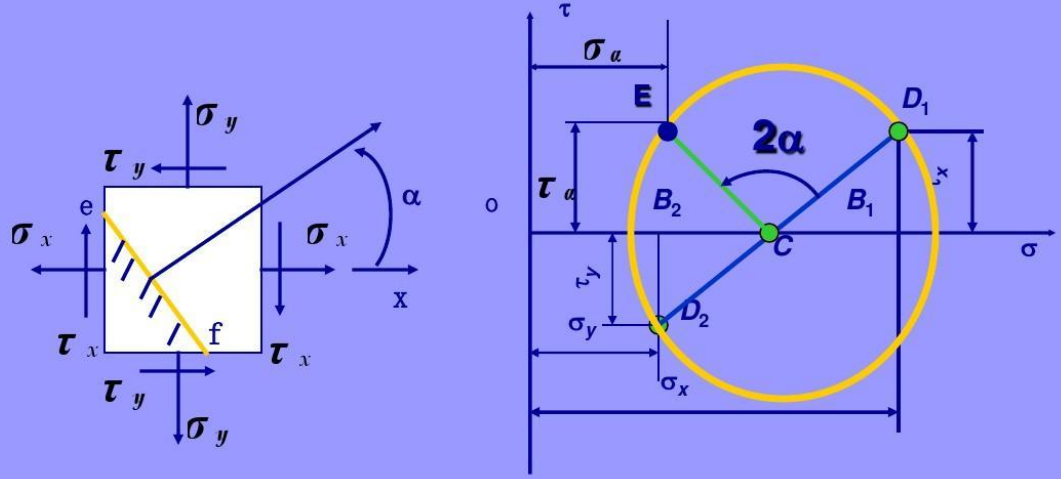 通过建立微元楔形体的平衡方程($\sum F_x = 0, \sum F_y = 0$),可推导出斜截面上的正应力 $\sigma_\theta$ 和剪应力 $\tau_\theta$: