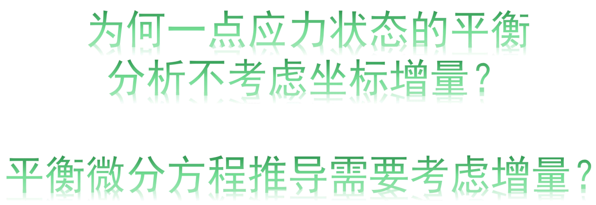 张量记法(爱因斯坦求和约定): $$ \sigma_{ji, j} + f_i = 0 $$ 其中下标 $j$ 后的逗号表示对坐标 $x_j$ 求偏导。这是弹性力学中最基本的方程之一,描述了应力场必须满足的平衡条件。
