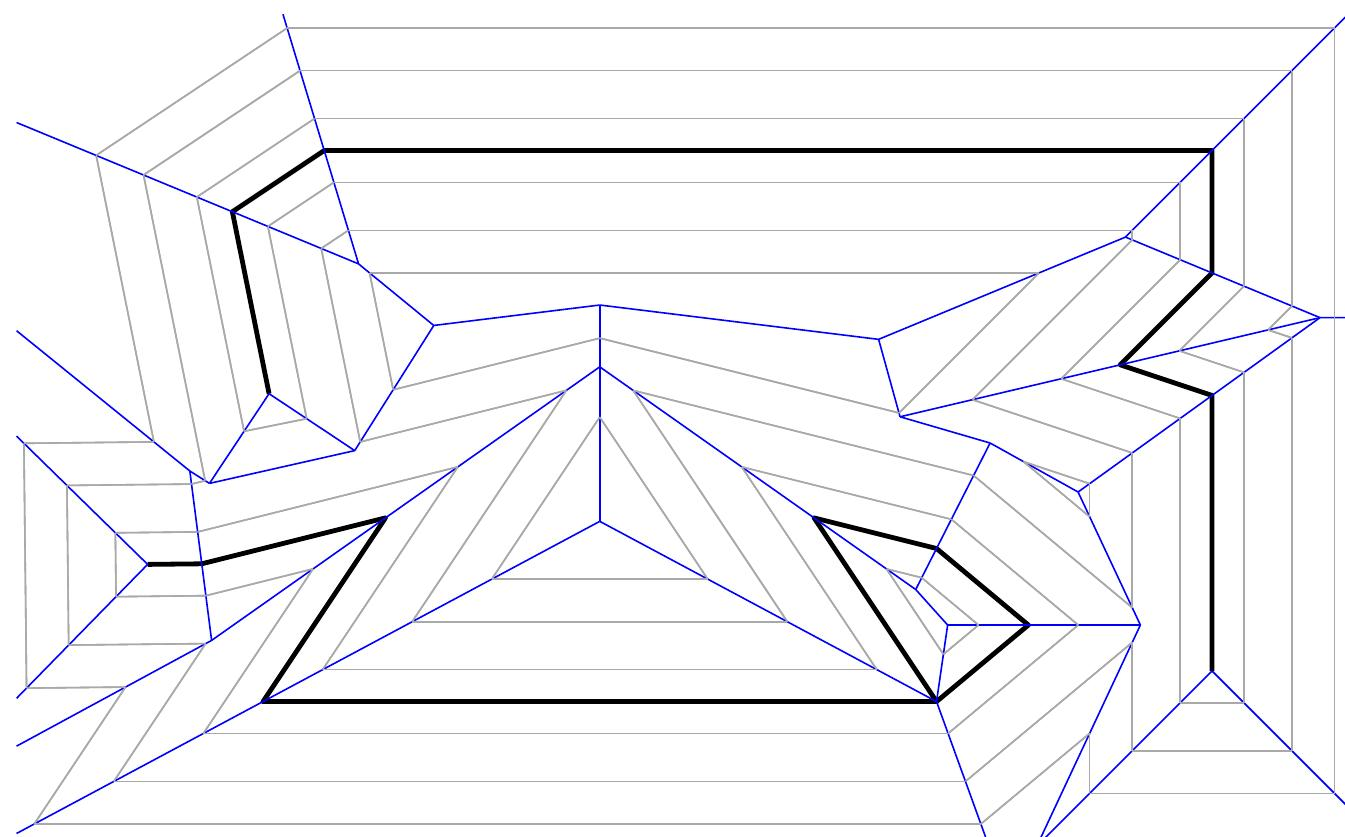 Figure 3: The straight skeleton S(G) (blue) of the planar straight-line graph $G$ (bold). The wavefronts at three points in time are depicted in gray.