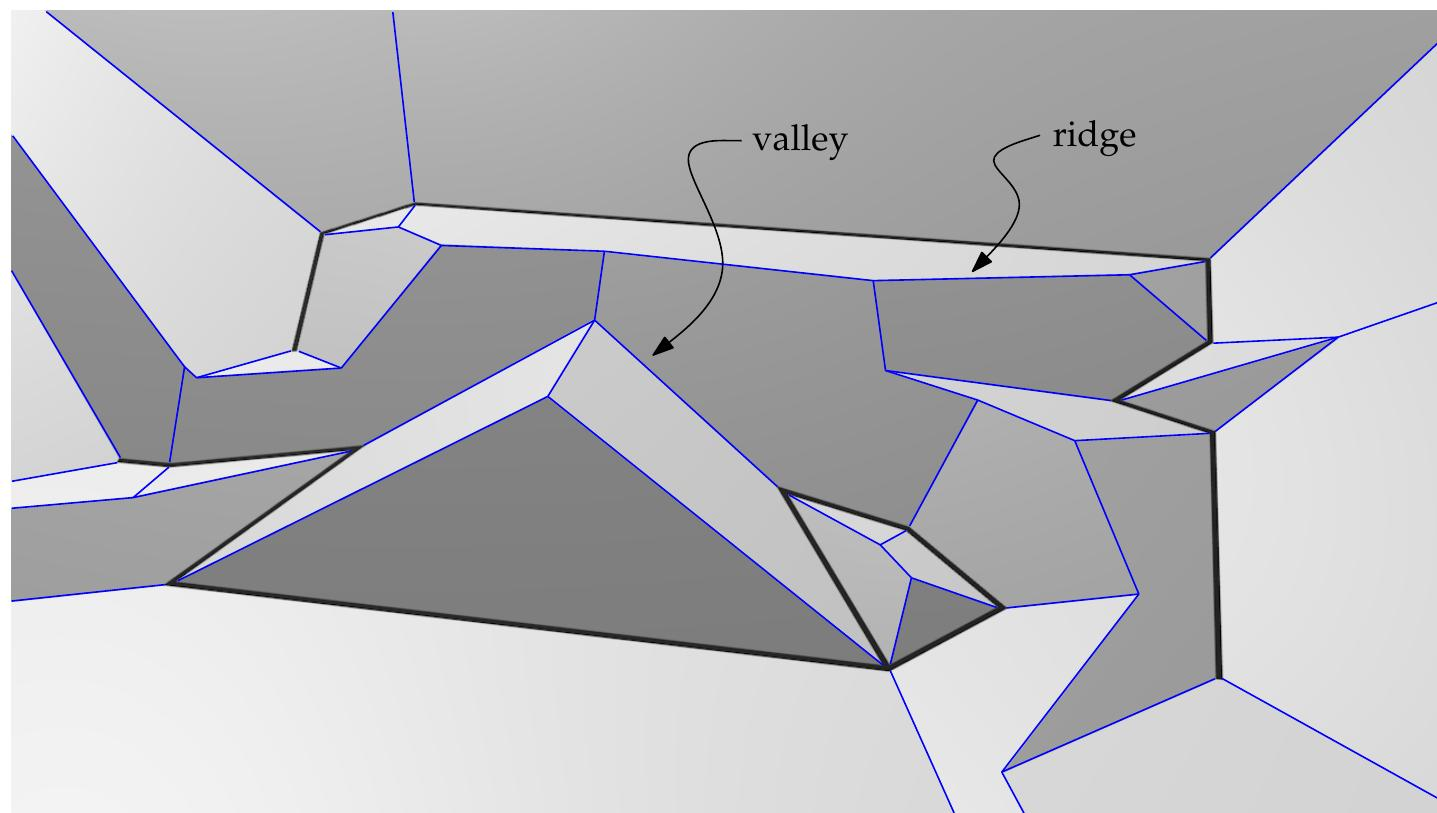 Definition 1.6 (reflex/convex arc, valley, ridge). We call the arcs of S (G) which are traced out by reflex (convex) wavefront vertices reflex arcs (convex arcs). We call a reflex edge of T (G) a valley and a convex edge of T (G) a ridge.