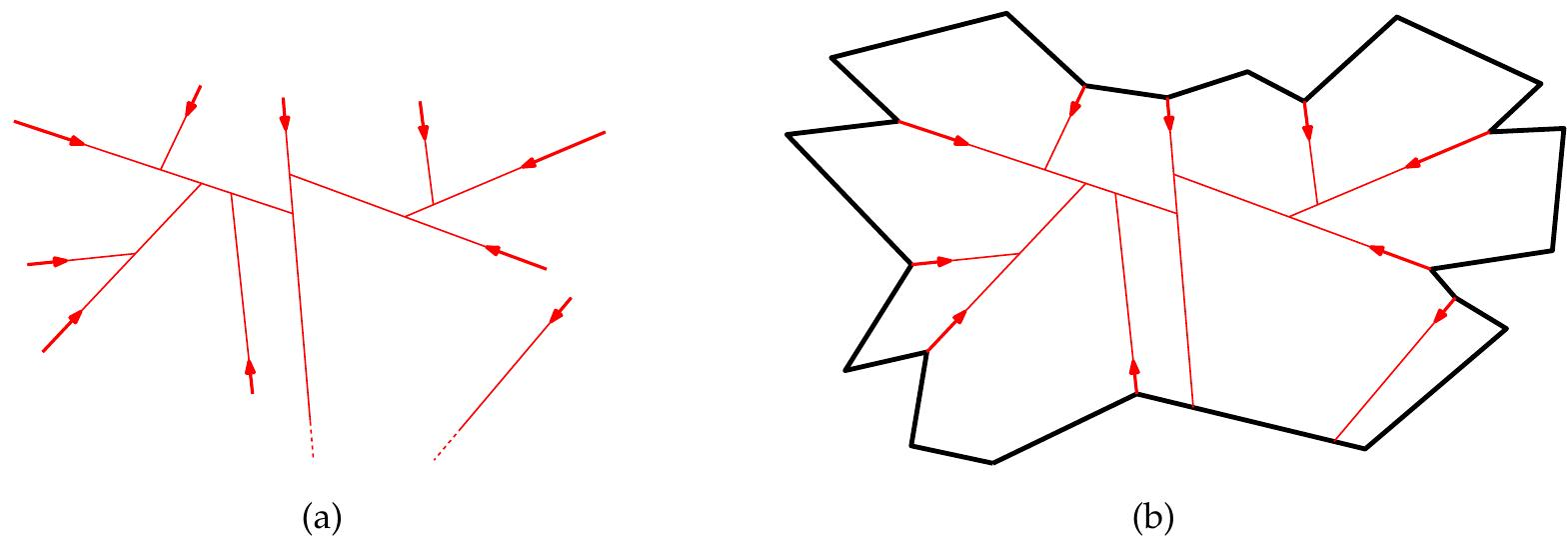 Figure 5: Left: The motorcycle graph $M(m1, . . . , m10)$ of ten motorcycles. The velocities are represented by red arrows. Right: The motorcycle graph M(P), shown in red, induced by a simple polygon $P$ (bold). Each reflex vertex of $P$ emanates a motorcycle.