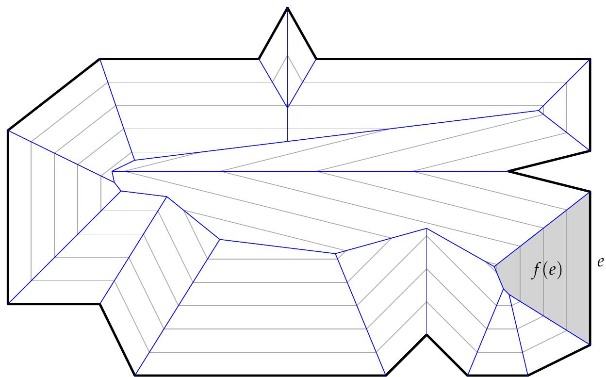 Figure 1: The straight skeleton S(P) (blue) of a simple polygon $P$ (bold) is defined by a wavefront propagation process where the edges of $P$ move inwards in a self-parallel manner. Five wavefronts at equally spaced points in time are shown in gray. The blue straight-line segments are called the arcs of S(P) and the common endpoints of arcs are called the nodes of S(P). We shade the face f (e) of one edge $e$ in light gray.
