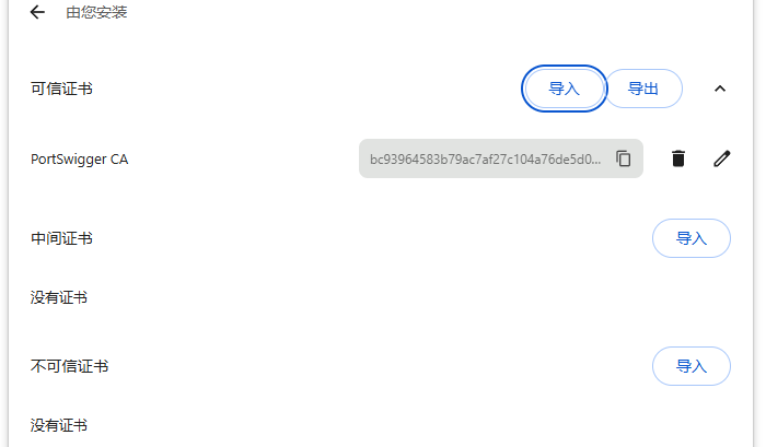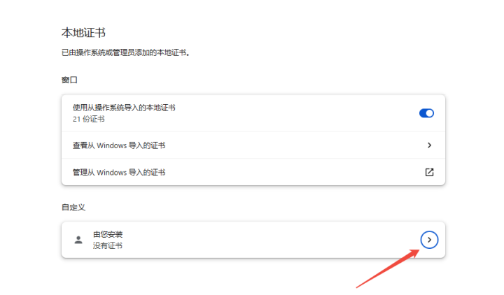Chrome: 设置 → 隐私和安全 → 安全 → 管理设备证书 → 导入 → 受信任的根证书颁发机构