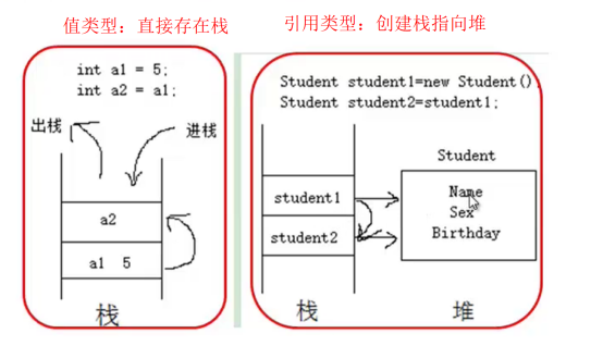 - 引用类型 (Reference Types):数据存储在堆 (Heap) 上,栈中只存储指向堆内存的地址(引用)。包含:类 (class)、接口 (interface)、数组、字符串 (string)、委托 (delegate)。