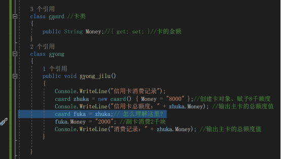 class Ceshi { public string Name { get; set; } public int Age { get; set; } } static class TestClass { public static void Function() { // 1. 值类型赋值(结构体或基本类型) // 假设 int 是值类型 Ceshi Stime1 = new Ceshi() { Name = "A", Age = 25 }; int age = Stime1.Age; // age 获得了 25 的副本 Stime1.Age = 35; // 修改 Stime1 不会影响局部变量 age // 2. 引用类型赋值(类) Ceshi Stime2 = new Ceshi() { Name = "B", Age = 30 }; // 关键点:这里是将 Stime2 的引用(地址)赋给了 Stime3 // 此时 Stime2 和 Stime3 指向堆内存中的同一个对象 Ceshi Stime3 = Stime2; // 修改 Stime2 指向对象的属性 Stime2.Name = "C"; // 输出结果 Console.WriteLine("Stime1 Age 的值 :" + Stime1.Age); // 输出 35 Console.WriteLine("局部变量 age 的值 :" + age); // 输出 25 (未变) Console.WriteLine("Stime2 Name 的值 :" + Stime2.Name); // 输出 C Console.WriteLine("Stime3 Name 的值 :" + Stime3.Name); // 输出 C (因为指向同一个对象) } }